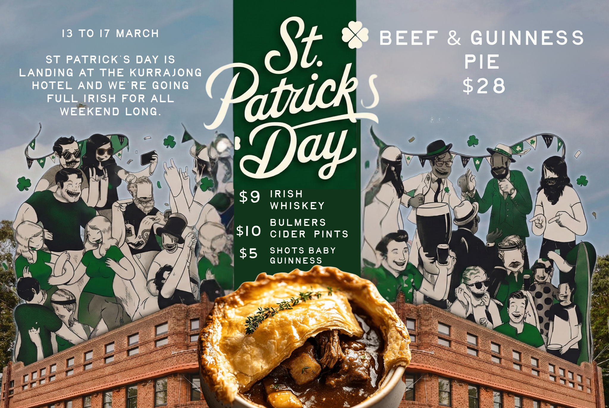 St Patrick's Day Weekend at Kurrajon The greenest weekend of the year is here and we're celebrating in style. With or our classic Steak & Guinness Pie for $28, served with creamy mash potato, green peas and a rich onion gravy. Honest Irish comfort food at its best. Wear your green and come celebrate with us. Sláinte!