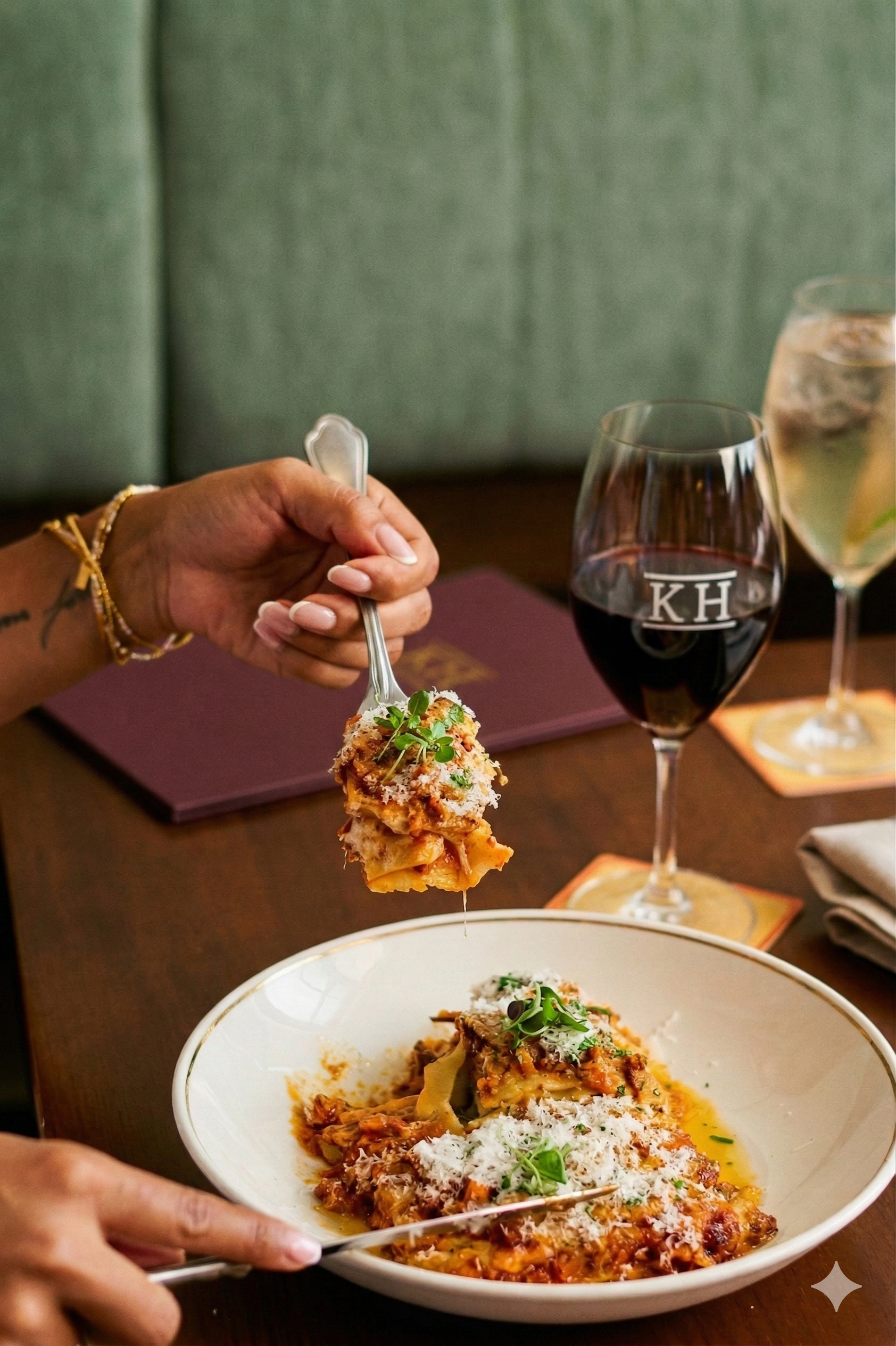 Thursday Lasagna + Glass of Wine All Day $28 Made by hand, made with love, made to keep you coming back every Thursday. The finest ingredients, real home cooking and a glass of wine to top it all off.